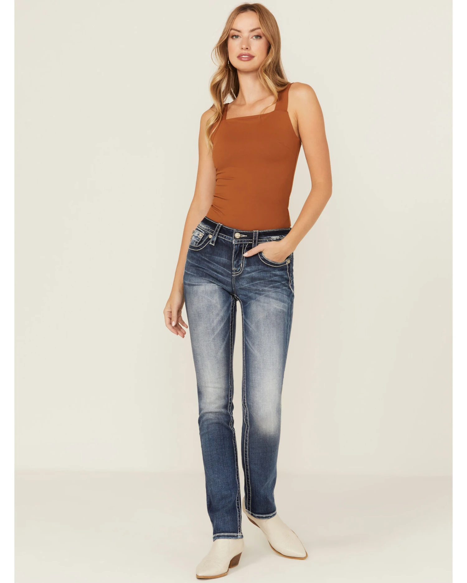 Miss Me Women’s Dark Wash Mid Rise Embroidered Fleur De Lis Jeans