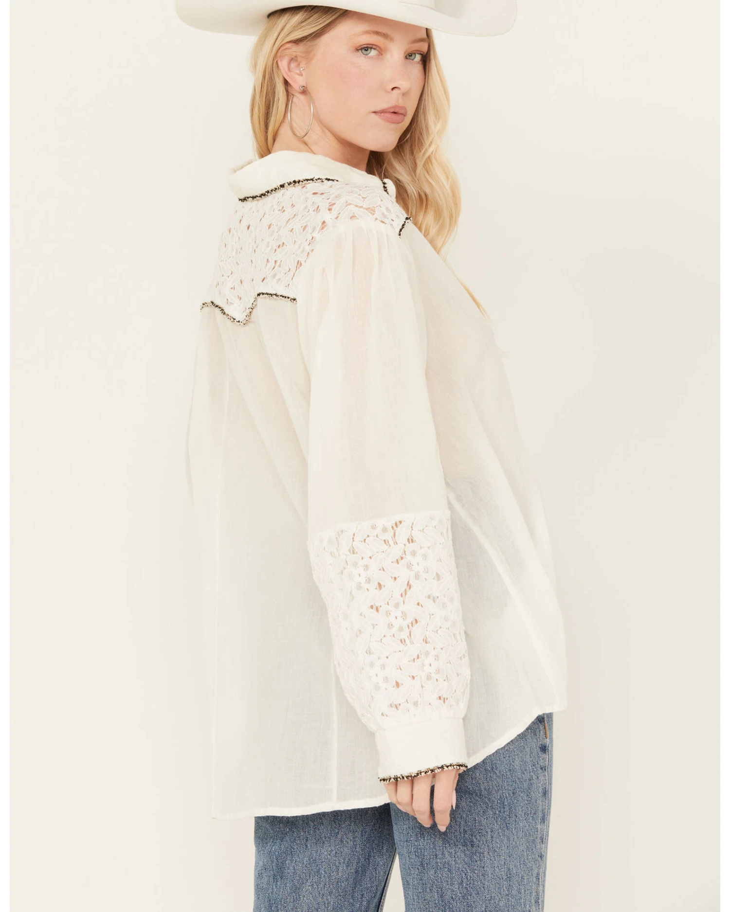 POL Women’s Lace Yoke Long Sleeve Button Down Shirt
